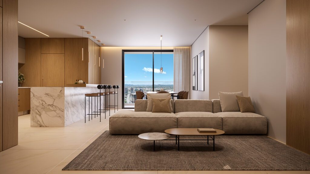 Nos ambientes comuns, o desenho dos espaços é pensado para aproximar. A área gourmet que se abre para o jardim, o salão de festas que se integra à varanda, todos esses espaços existem para transformar a convivência em experiência. A piscina e a academia não são apenas áreas de lazer ou bem-estar: são pontos de encontro, onde histórias começam e laços se fortalecem. Já nas áreas íntimas, a conexão acontece de outra maneira: através da sensação de pertencimento. O quarto, a varanda privativa, cada ambiente traduz o desejo de estar em casa, de encontrar silêncio e harmonia depois do movimento do dia. São espaços que respeitam o ritmo individual sem perder o elo com o coletivo.